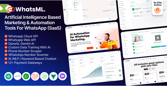 Revolusikan Pemasaran WhatsApp Anda dengan Otomatisasi Bertenaga AI! WhatsML adalah platform SaaS terbaik untuk agensi, pemasar, dan bisnis untuk meningkatkan komunikasi, pembuatan prospek, dan otomatisasi kampanye menggunakan AI, web scraping, dan API WhatsApp resmi maupun berbasis web. WhatsML mencakup 12+ gateway pembayaran otomatis dan metode pembayaran offline tanpa batas. Dibangun dengan teknologi modern seperti Laravel, Inertia.js, Vue.js, dan Node.js. Fitur ini memiliki penginstal web 2-klik untuk penyebaran berbasis UI yang mudah.