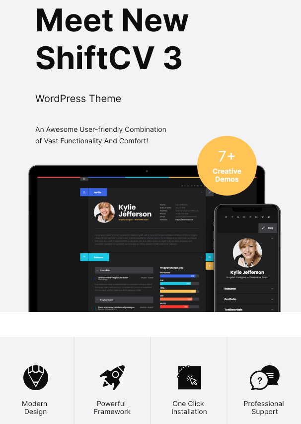 ShiftCV adalah Resume, Portofolio kontemporer, responsif & modern dengan Tema WordPress Blog Pribadi. tema ini menggabungkan desain sederhana dan bersih dengan solusi tampilan yang segar, penuh warna & halus.